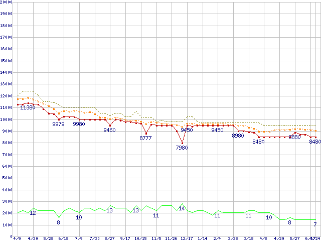 HD154UI (1.5TB,32MB)の価格推移↓次グラフ(2009年4月9日〜2010年6月24日)※このグラフは過去のデータも税率5%相当に調整した税込み相当額のグラフです。 税率変更や、総額表示方式導入(2004年4月)の影響は除いています。●関連グラフHDD/SSD主要製品の最安値推移HDD/SSD主要製品(最安値1万円未満)の最安値推移HDD 1.5TB〜2TB未満の最安値推移EcoGreen F2 (5400rpm,3Gb/s)の最安値推移●凡例最安値(点線部は販売店未確認または未調査)平均値最高値ショップ数