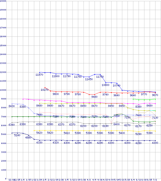 CPU主要製品(最安値1万円未満)の最安値推移↑前グラフ↓次グラフ(2009年12月18日〜2010年7月2日)※このグラフは過去のデータも税率5%相当に調整した税込み相当額のグラフです。凡例Athlon II X4 635 (2.9GHz,L2 512KB×4,TDP 95W)Phenom II X2 555 Black Edition (3.2GHz,L2 512KB×2,L3 6MB)Pentium E6700 (3.20GHz,L2 2MB)Pentium G6950 (2.8GHz)Athlon II X2 245e (2.9GHz,L2 1MB×2,TDP 45W)Athlon II X3 440 (3.0GHz,L2 512KB×3,TDP 95W)Pentium E6500 (2.93GHz,L2 2MB)Athlon II X2 260 (3.2GHz,L2 1MB×2,TDP 65W)Athlon II X2 240e (2.8GHz,L2 1MB×2,TDP 45W)Athlon II X2 255 (3.1GHz,L2 1MB×2,TDP 65W)Athlon II X2 250 (3.0GHz,L2 1MB×2,TDP 65W)Celeron E3400 (2.6GHz)Celeron E3300 (2.5GHz)※製品名をクリックすると個別のグラフを表示します※点線部は販売店が確認できなかった、または調査データがないことを示します