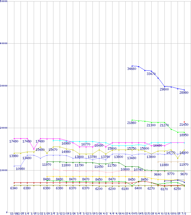AMD系CPUの最安値推移↑前グラフ↓次グラフ(2009年12月18日〜2010年7月2日)※このグラフは過去のデータも税率5%相当に調整した税込み相当額のグラフです。凡例Phenom II X6 1090T Black Edition (3.2GHz,L2 512KB×6,L3 6MB,TDP 125W)Phenom II X6 1055T (2.8GHz,L2 512KB×6,L3 6MB,TDP 95W)Phenom II X6 1055T (2.8GHz,L2 512KB×6,L3 6MB,TDP 125W)Phenom II X4 965 Black Edition (3.4GHz,L2 512KB×4,L3 6MB,TDP 125W)Phenom II X4 910e (2.6GHz,L2 512KB×4,L3 6MB,TDP 65W)Phenom II X4 955 Black Edition (3.2GHz,L2 512KB×4,L3 6MB,TDP 125W)Phenom II X4 945 (3.0GHz,L2 512KB×4,L3 6MB,TDP 95W)Athlon II X4 640 (3.0GHz,L2 512KB×4,TDP 95W)Athlon II X4 635 (2.9GHz,L2 512KB×4,TDP 95W)Phenom II X2 555 Black Edition (3.2GHz,L2 512KB×2,L3 6MB)Athlon II X2 245e (2.9GHz,L2 1MB×2,TDP 45W)Athlon II X3 440 (3.0GHz,L2 512KB×3,TDP 95W)Athlon II X2 260 (3.2GHz,L2 1MB×2,TDP 65W)Athlon II X2 240e (2.8GHz,L2 1MB×2,TDP 45W)Athlon II X2 255 (3.1GHz,L2 1MB×2,TDP 65W)Athlon II X2 250 (3.0GHz,L2 1MB×2,TDP 65W)※製品名をクリックすると個別のグラフを表示します※点線部は販売店が確認できなかった、または調査データがないことを示します