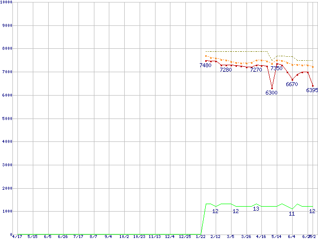 Athlon II X2 255 (3.1GHz,L2 1MB×2,TDP 65W)の価格推移↑前グラフ↓次グラフ(2009年4月17日〜2010年7月2日)※このグラフは過去のデータも税率5%相当に調整した税込み相当額のグラフです。●関連グラフCPU主要製品の最安値推移CPU主要製品(最安値1万円未満)の最安値推移AMD系CPUの最安値推移Socket AM3 (Dual Core)の最安値推移●凡例最安値(点線部は販売店未確認または未調査)平均値最高値ショップ数