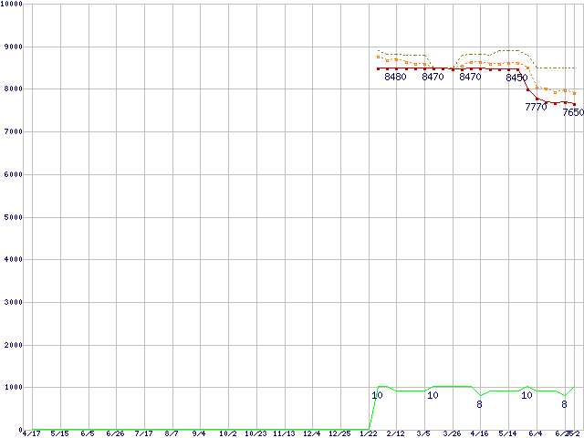 Athlon II X3 440 (3.0GHz,L2 512KB×3,TDP 95W)の価格推移↑前グラフ↓次グラフ(2009年4月17日〜2010年7月2日)※このグラフは過去のデータも税率5%相当に調整した税込み相当額のグラフです。●関連グラフCPU主要製品の最安値推移CPU主要製品(最安値1万円未満)の最安値推移AMD系CPUの最安値推移Socket AM3 (Triple Core)の最安値推移●凡例最安値(点線部は販売店未確認または未調査)平均値最高値ショップ数