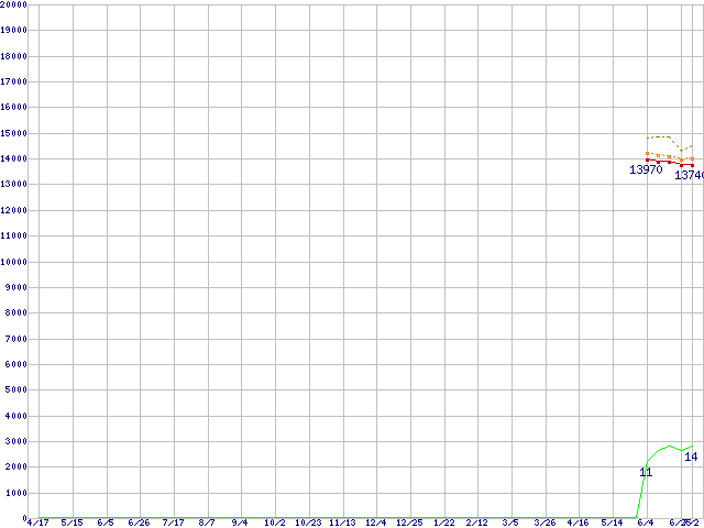 Core i3-550 (3.20GHz)の価格推移↑前グラフ↓次グラフ(2009年4月17日〜2010年7月2日)※このグラフは過去のデータも税率5%相当に調整した税込み相当額のグラフです。●関連グラフCPU主要製品の最安値推移CPU主要製品(最安値1万円〜2万円未満)の最安値推移Intel系CPUの最安値推移LGA1156 (L3キャッシュ4MB,Dual Core,GPU内蔵,Hyper-Threading,TDP 73〜87W)の最安値推移●凡例最安値(点線部は販売店未確認または未調査)平均値最高値ショップ数