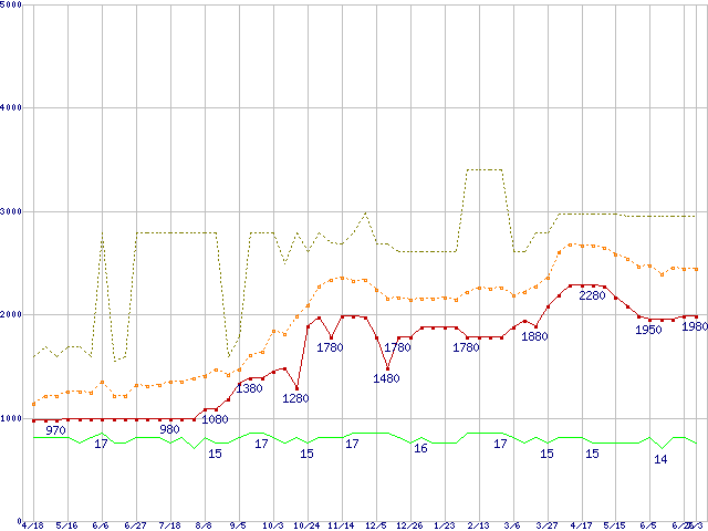 PC2-6400 1GBの価格推移↑前グラフ↓次グラフ(2009年4月18日〜2010年7月3日)※このグラフは過去のデータも税率5%相当に調整した税込み相当額のグラフです。 税率変更や、総額表示方式導入(2004年4月)の影響は除いています。●関連グラフメモリ主要製品の最安値推移1GBモジュールの最安値推移メモリ主要製品(最安値5千円未満)の最安値推移PC2-6400(DDR2-800) DDR2 SDRAM DIMMの最安値推移●凡例最安値(点線部は販売店未確認または未調査)平均値最高値ショップ数
