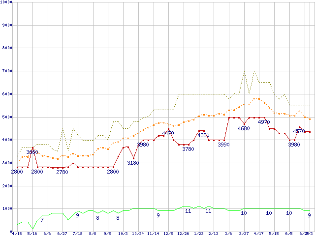 PC3-10600 2GBの価格推移↑前グラフ↓次グラフ(2009年4月18日〜2010年7月3日)※このグラフは過去のデータも税率5%相当に調整した税込み相当額のグラフです。 税率変更や、総額表示方式導入(2004年4月)の影響は除いています。●関連グラフメモリ主要製品の最安値推移2GBモジュール/1GBモジュール×2枚の最安値推移メモリ主要製品(最安値5千円未満)の最安値推移PC3-10600(DDR3-1333) DDR3 SDRAM DIMMの最安値推移●凡例最安値(点線部は販売店未確認または未調査)平均値最高値ショップ数