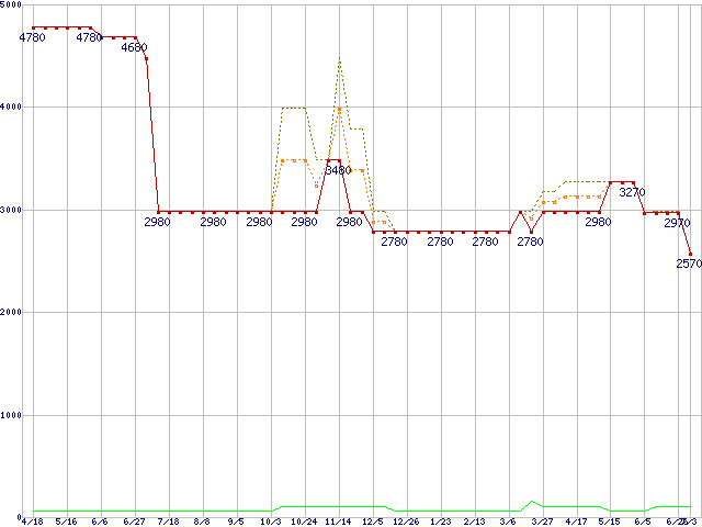 PC3-12800 1GBの価格推移↑前グラフ↓次グラフ(2009年4月18日〜2010年7月3日)※このグラフは過去のデータも税率5%相当に調整した税込み相当額のグラフです。 税率変更や、総額表示方式導入(2004年4月)の影響は除いています。●関連グラフメモリ主要製品の最安値推移1GBモジュールの最安値推移メモリ主要製品(最安値5千円未満)の最安値推移PC3-12800(DDR3-1600) DDR3 SDRAM DIMMの最安値推移●凡例最安値(点線部は販売店未確認または未調査)平均値最高値ショップ数