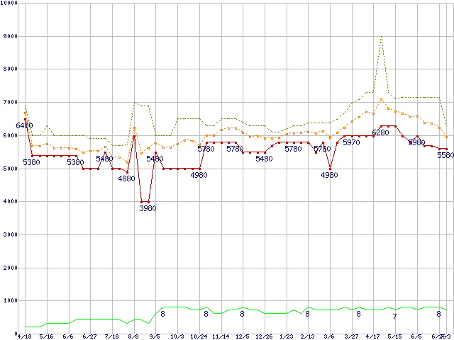 PC3-12800 1GB×2枚組みセットの価格推移↑前グラフ↓次グラフ(2009年4月18日〜2010年7月3日)※このグラフは過去のデータも税率5%相当に調整した税込み相当額のグラフです。 税率変更や、総額表示方式導入(2004年4月)の影響は除いています。●関連グラフメモリ主要製品の最安値推移2GBモジュール/1GBモジュール×2枚の最安値推移メモリ主要製品(最安値5千円〜1万円未満)の最安値推移PC3-12800(DDR3-1600) DDR3 SDRAM DIMMの最安値推移●凡例最安値(点線部は販売店未確認または未調査)平均値最高値ショップ数