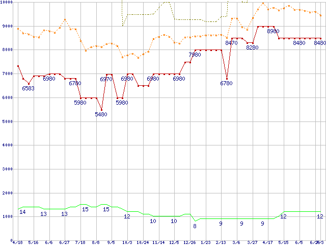 PC3-12800 1GB×3枚組みセットの価格推移↑前グラフ↓次グラフ(2009年4月18日〜2010年7月3日)※このグラフは過去のデータも税率5%相当に調整した税込み相当額のグラフです。 税率変更や、総額表示方式導入(2004年4月)の影響は除いています。●関連グラフメモリ主要製品の最安値推移メモリ主要製品(最安値5千円〜1万円未満)の最安値推移PC3-12800(DDR3-1600) DDR3 SDRAM DIMMの最安値推移●凡例最安値(点線部は販売店未確認または未調査)平均値最高値ショップ数