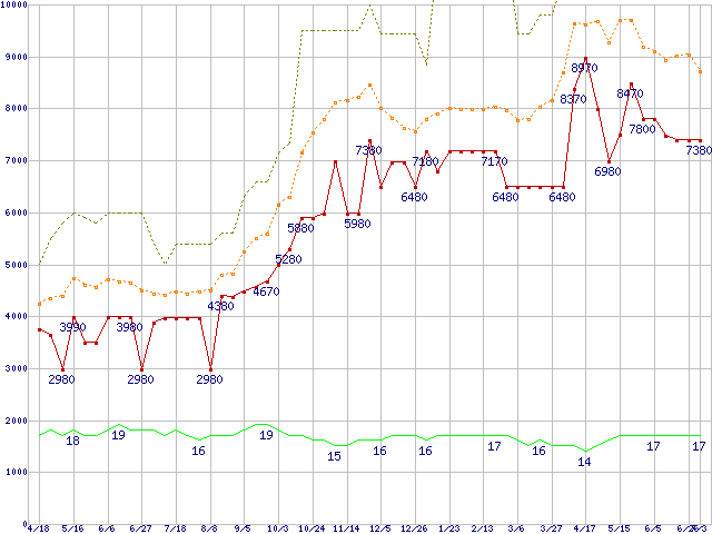 PC2-6400 2GB×2枚組みセットの価格推移↑前グラフ↓次グラフ(2009年4月18日〜2010年7月3日)※このグラフは過去のデータも税率5%相当に調整した税込み相当額のグラフです。 税率変更や、総額表示方式導入(2004年4月)の影響は除いています。●関連グラフメモリ主要製品の最安値推移4GBモジュール/2GBモジュール×2枚の最安値推移メモリ主要製品(最安値5千円〜1万円未満)の最安値推移PC2-6400(DDR2-800) DDR2 SDRAM DIMMの最安値推移●凡例最安値(点線部は販売店未確認または未調査)平均値最高値ショップ数