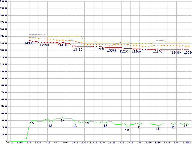 Core 2 Duo E7600 (3.06GHz,L2 3MB)の価格推移↑前グラフ↓次グラフ(2009年4月17日〜2010年7月2日)※このグラフは過去のデータも税率5%相当に調整した税込み相当額のグラフです。●関連グラフCPU主要製品の最安値推移CPU主要製品(最安値1万円〜2万円未満)の最安値推移Intel系CPUの最安値推移LGA775 (FSB 1066MHz,Dual Core,TDP 65W)の最安値推移●凡例最安値(点線部は販売店未確認または未調査)平均値最高値ショップ数
