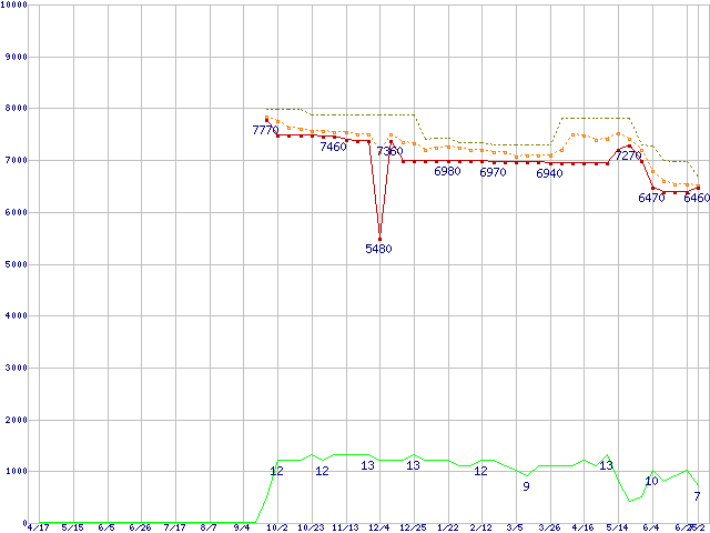 Athlon II X2 240e (2.8GHz,L2 1MB×2,TDP 45W)の価格推移↑前グラフ↓次グラフ(2009年4月17日〜2010年7月2日)※このグラフは過去のデータも税率5%相当に調整した税込み相当額のグラフです。●関連グラフCPU主要製品の最安値推移CPU主要製品(最安値1万円未満)の最安値推移AMD系CPUの最安値推移Socket AM3 (Dual Core)の最安値推移●凡例最安値(点線部は販売店未確認または未調査)平均値最高値ショップ数