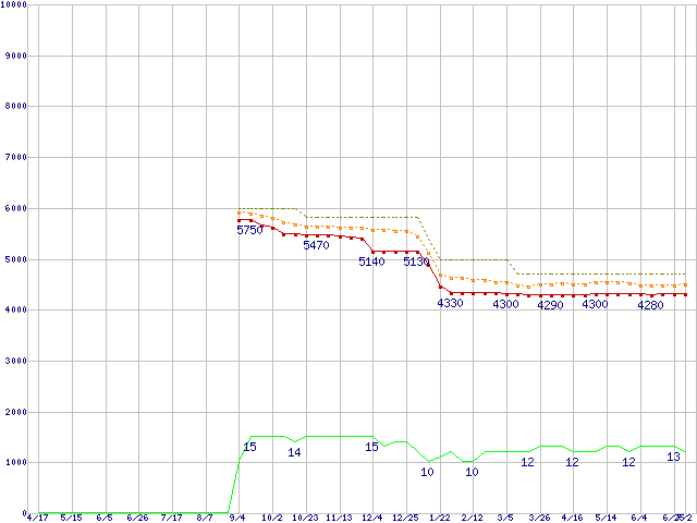 Celeron E3300 (2.5GHz)の価格推移↑前グラフ↓次グラフ(2009年4月17日〜2010年7月2日)※このグラフは過去のデータも税率5%相当に調整した税込み相当額のグラフです。●関連グラフCPU主要製品の最安値推移CPU主要製品(最安値1万円未満)の最安値推移Intel系CPUの最安値推移LGA775 (FSB 800MHz,L2 1MB,Dual Core,TDP 65W)の最安値推移●凡例最安値(点線部は販売店未確認または未調査)平均値最高値ショップ数