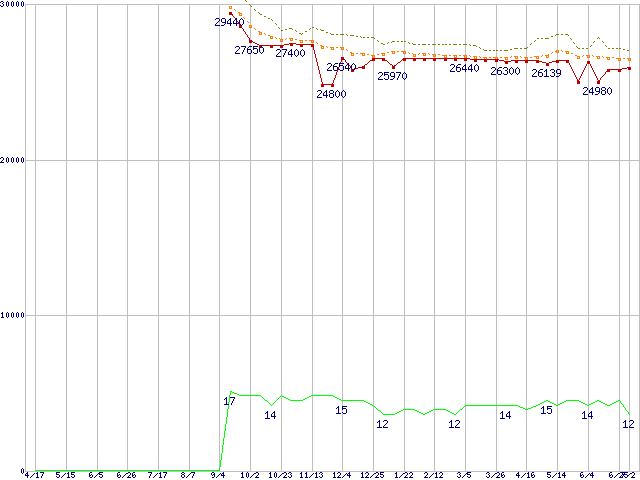 Core i7-860 (2.80GHz)の価格推移↑前グラフ↓次グラフ(2009年4月17日〜2010年7月2日)※このグラフは過去のデータも税率5%相当に調整した税込み相当額のグラフです。●関連グラフCPU主要製品の最安値推移CPU主要製品(最安値2万円〜3万円未満)の最安値推移Intel系CPUの最安値推移LGA1156 (L3キャッシュ8MB,Quad Core,Hyper-Threading,TDP 82〜95W)の最安値推移●凡例最安値(点線部は販売店未確認または未調査)平均値最高値ショップ数