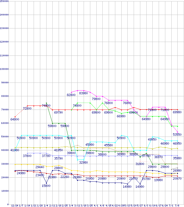 | HDD/SSD主要製品(最安値2万円以上)の最安値推移 |