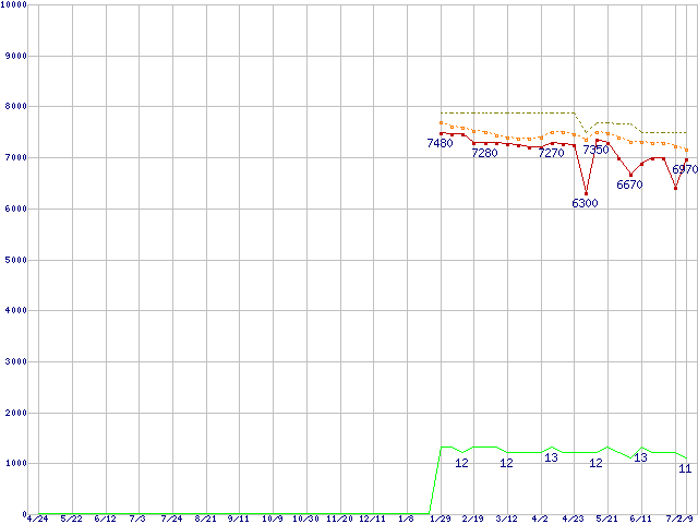 Athlon II X2 255 (3.1GHz,L2 1MB×2,TDP 65W)の価格推移↑前グラフ↓次グラフ(2009年4月24日〜2010年7月9日)※このグラフは過去のデータも税率5%相当に調整した税込み相当額のグラフです。●関連グラフCPU主要製品の最安値推移CPU主要製品(最安値1万円未満)の最安値推移AMD系CPUの最安値推移Socket AM3 (Dual Core)の最安値推移●凡例最安値(点線部は販売店未確認または未調査)平均値最高値ショップ数