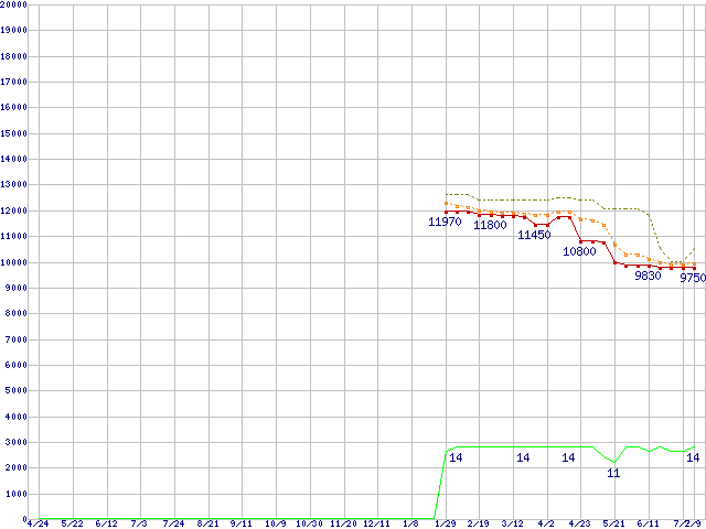 Athlon II X4 635 (2.9GHz,L2 512KB×4,TDP 95W)の価格推移↑前グラフ↓次グラフ(2009年4月24日〜2010年7月9日)※このグラフは過去のデータも税率5%相当に調整した税込み相当額のグラフです。●関連グラフCPU主要製品の最安値推移CPU主要製品(最安値1万円未満)の最安値推移AMD系CPUの最安値推移Socket AM3 (Quad Core)の最安値推移●凡例最安値(点線部は販売店未確認または未調査)平均値最高値ショップ数