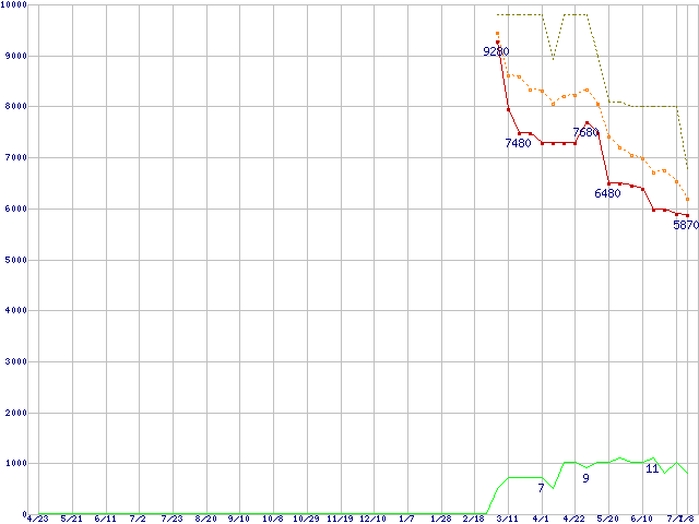 WD10EALS (1TB,32MB)の価格推移↑前グラフ↓次グラフ(2009年4月23日〜2010年7月8日)※このグラフは過去のデータも税率5%相当に調整した税込み相当額のグラフです。 税率変更や、総額表示方式導入(2004年4月)の影響は除いています。●関連グラフHDD/SSD主要製品の最安値推移HDD/SSD主要製品(最安値1万円未満)の最安値推移HDD 1TB〜1.5TB未満の最安値推移WD Caviar Blue (7200rpm,3Gb/s)の最安値推移●凡例最安値(点線部は販売店未確認または未調査)平均値最高値ショップ数