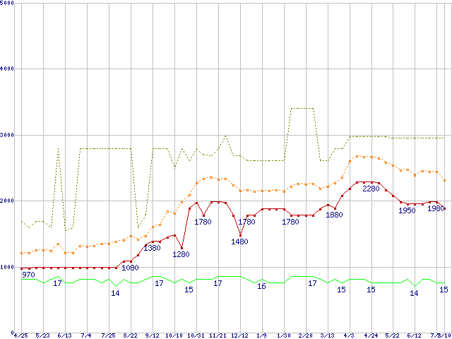PC2-6400 1GBの価格推移↑前グラフ↓次グラフ(2009年4月25日〜2010年7月10日)※このグラフは過去のデータも税率5%相当に調整した税込み相当額のグラフです。 税率変更や、総額表示方式導入(2004年4月)の影響は除いています。●関連グラフメモリ主要製品の最安値推移1GBモジュールの最安値推移メモリ主要製品(最安値5千円未満)の最安値推移PC2-6400(DDR2-800) DDR2 SDRAM DIMMの最安値推移●凡例最安値(点線部は販売店未確認または未調査)平均値最高値ショップ数