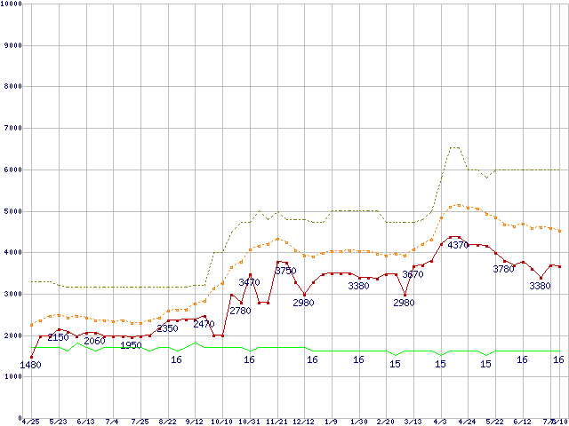 PC2-6400 2GBの価格推移↑前グラフ↓次グラフ(2009年4月25日〜2010年7月10日)※このグラフは過去のデータも税率5%相当に調整した税込み相当額のグラフです。 税率変更や、総額表示方式導入(2004年4月)の影響は除いています。●関連グラフメモリ主要製品の最安値推移2GBモジュール/1GBモジュール×2枚の最安値推移メモリ主要製品(最安値5千円未満)の最安値推移PC2-6400(DDR2-800) DDR2 SDRAM DIMMの最安値推移●凡例最安値(点線部は販売店未確認または未調査)平均値最高値ショップ数