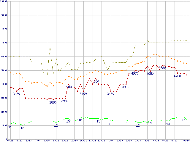 PC3-10600 1GB×2枚組みセットの価格推移↑前グラフ↓次グラフ(2009年4月25日〜2010年7月10日)※このグラフは過去のデータも税率5%相当に調整した税込み相当額のグラフです。 税率変更や、総額表示方式導入(2004年4月)の影響は除いています。●関連グラフメモリ主要製品の最安値推移2GBモジュール/1GBモジュール×2枚の最安値推移メモリ主要製品(最安値5千円未満)の最安値推移PC3-10600(DDR3-1333) DDR3 SDRAM DIMMの最安値推移●凡例最安値(点線部は販売店未確認または未調査)平均値最高値ショップ数
