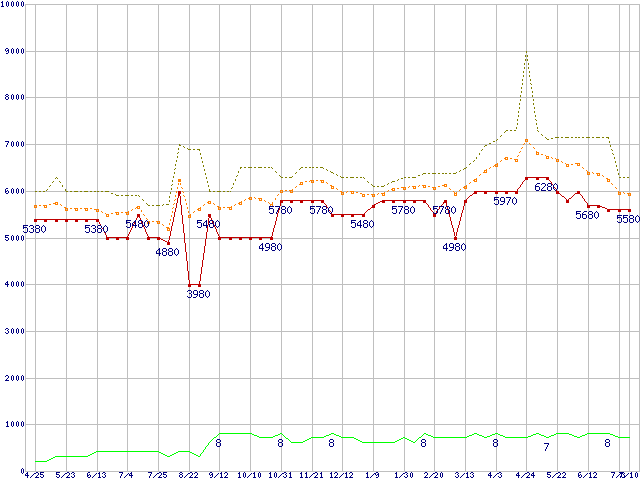 PC3-12800 1GB×2枚組みセットの価格推移↑前グラフ↓次グラフ(2009年4月25日〜2010年7月10日)※このグラフは過去のデータも税率5%相当に調整した税込み相当額のグラフです。 税率変更や、総額表示方式導入(2004年4月)の影響は除いています。●関連グラフメモリ主要製品の最安値推移2GBモジュール/1GBモジュール×2枚の最安値推移メモリ主要製品(最安値5千円〜1万円未満)の最安値推移PC3-12800(DDR3-1600) DDR3 SDRAM DIMMの最安値推移●凡例最安値(点線部は販売店未確認または未調査)平均値最高値ショップ数