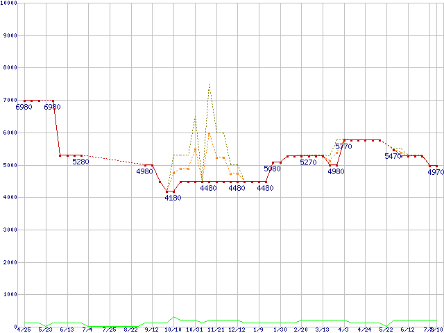 PC3-12800 2GBの価格推移↑前グラフ↓次グラフ(2009年4月25日〜2010年7月10日)※このグラフは過去のデータも税率5%相当に調整した税込み相当額のグラフです。 税率変更や、総額表示方式導入(2004年4月)の影響は除いています。●関連グラフメモリ主要製品の最安値推移2GBモジュール/1GBモジュール×2枚の最安値推移メモリ主要製品(最安値5千円未満)の最安値推移PC3-12800(DDR3-1600) DDR3 SDRAM DIMMの最安値推移●凡例最安値(点線部は販売店未確認または未調査)平均値最高値ショップ数