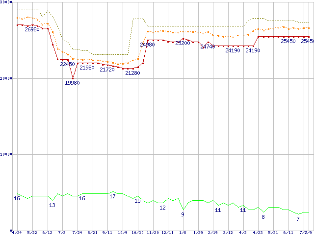 Core 2 Quad Q9550 (2.83GHz,L2 6MB×2)の価格推移↑前グラフ↓次グラフ(2009年4月24日〜2010年7月9日)※このグラフは過去のデータも税率5%相当に調整した税込み相当額のグラフです。●関連グラフCPU主要製品の最安値推移CPU主要製品(最安値2万円〜3万円未満)の最安値推移Intel系CPUの最安値推移LGA775 (FSB 1333MHz,Quad Core,TDP 95W)の最安値推移●凡例最安値(点線部は販売店未確認または未調査)平均値最高値ショップ数