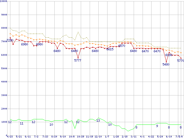 HD103SI (1TB,32MB)の価格推移↑前グラフ↓次グラフ(2009年4月23日〜2010年7月8日)※このグラフは過去のデータも税率5%相当に調整した税込み相当額のグラフです。 税率変更や、総額表示方式導入(2004年4月)の影響は除いています。●関連グラフHDD/SSD主要製品の最安値推移HDD/SSD主要製品(最安値1万円未満)の最安値推移HDD 1TB〜1.5TB未満の最安値推移EcoGreen F2 (5400rpm,3Gb/s)の最安値推移●凡例最安値(点線部は販売店未確認または未調査)平均値最高値ショップ数