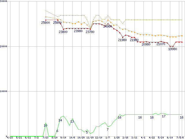X25-M(G2) (80GB,MLC)の価格推移↑前グラフ↓次グラフ(2009年4月23日〜2010年7月8日)※このグラフは過去のデータも税率5%相当に調整した税込み相当額のグラフです。 税率変更や、総額表示方式導入(2004年4月)の影響は除いています。●関連グラフHDD/SSD主要製品の最安値推移HDD/SSD主要製品(最安値2万円以上)の最安値推移HDD 80GB〜100GB未満の最安値推移X25-M Mainstream SATA SSD (SSD,3Gbps,2.5インチ)の最安値推移●凡例最安値(点線部は販売店未確認または未調査)平均値最高値ショップ数