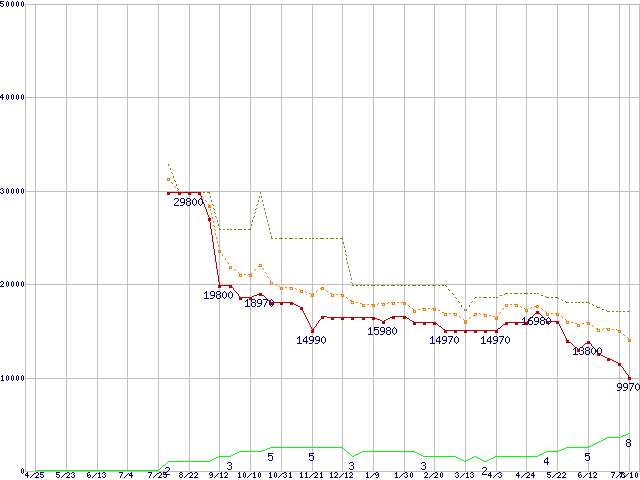 PC3-10600 4GBの価格推移↑前グラフ↓次グラフ(2009年4月25日〜2010年7月10日)※このグラフは過去のデータも税率5%相当に調整した税込み相当額のグラフです。 税率変更や、総額表示方式導入(2004年4月)の影響は除いています。●関連グラフメモリ主要製品の最安値推移4GBモジュール/2GBモジュール×2枚の最安値推移メモリ主要製品(最安値5千円〜1万円未満)の最安値推移PC3-10600(DDR3-1333) DDR3 SDRAM DIMMの最安値推移PC3-10600 4GB/PC3-10600 4GB×2枚組みセットの最安値推移●凡例最安値(点線部は販売店未確認または未調査)平均値最高値ショップ数