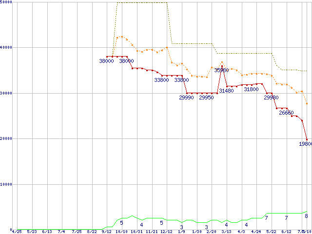 PC3-10600 4GB×2枚組みセットの価格推移↑前グラフ↓次グラフ(2009年4月25日〜2010年7月10日)※このグラフは過去のデータも税率5%相当に調整した税込み相当額のグラフです。 税率変更や、総額表示方式導入(2004年4月)の影響は除いています。●関連グラフメモリ主要製品の最安値推移メモリ主要製品(最安値1万円以上)の最安値推移PC3-10600(DDR3-1333) DDR3 SDRAM DIMMの最安値推移PC3-10600 4GB/PC3-10600 4GB×2枚組みセットの最安値推移●凡例最安値(点線部は販売店未確認または未調査)平均値最高値ショップ数