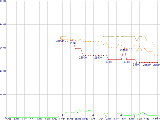 PC2-6400 4GB×2枚組みセットの価格推移↑前グラフ↓次グラフ(2009年4月25日〜2010年7月10日)※このグラフは過去のデータも税率5%相当に調整した税込み相当額のグラフです。 税率変更や、総額表示方式導入(2004年4月)の影響は除いています。●関連グラフメモリ主要製品の最安値推移メモリ主要製品(最安値1万円以上)の最安値推移PC2-6400(DDR2-800) DDR2 SDRAM DIMMの最安値推移●凡例最安値(点線部は販売店未確認または未調査)平均値最高値ショップ数