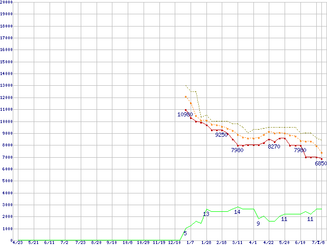 WD15EARS (1.5TB,64MB)の価格推移↑前グラフ(2009年4月23日〜2010年7月8日)※このグラフは過去のデータも税率5%相当に調整した税込み相当額のグラフです。 税率変更や、総額表示方式導入(2004年4月)の影響は除いています。●関連グラフHDD/SSD主要製品の最安値推移HDD/SSD主要製品(最安値1万円未満)の最安値推移HDD 1.5TB〜2TB未満の最安値推移WD Caviar Green (3Gb/s)の最安値推移●凡例最安値(点線部は販売店未確認または未調査)平均値最高値ショップ数
