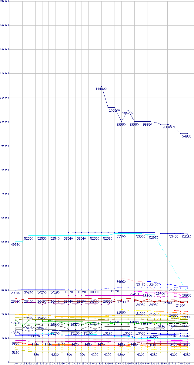 CPU主要製品の最安値推移↑前グラフ↓次グラフ(2010年1月8日〜2010年7月16日)※このグラフは過去のデータも税率5%相当に調整した税込み相当額のグラフです。凡例Core i7-980X Extreme Edition (3.33GHz)Core i7-960 (3.20GHz)Core i7-875K (2.93GHz)Core 2 Quad Q9650 (3.00GHz,L2 6MB×2)Core i7-870 (2.93GHz)Phenom II X6 1090T Black Edition (3.2GHz,L2 512KB×6,L3 6MB,TDP 125W)Core i5-680 (3.6GHz)Core i7-930 (2.80GHz)Core 2 Quad Q9550 (2.83GHz,L2 6MB×2)Core 2 Duo E8600 (3.33GHz,L2 6MB)Core i7-860 (2.80GHz)Phenom II X6 1055T (2.8GHz,L2 512KB×6,L3 6MB,TDP 95W)Core i5-655K (3.2GHz)Core i5-661 (3.33GHz)Core i5-660 (3.33GHz)Phenom II X6 1055T (2.8GHz,L2 512KB×6,L3 6MB,TDP 125W)Core i5-750 (2.66GHz)Core 2 Duo E8500 (3.16GHz,L2 6MB)Core i5-650 (3.2GHz)Phenom II X4 965 Black Edition (3.4GHz,L2 512KB×4,L3 6MB,TDP 125W)Phenom II X4 910e (2.6GHz,L2 512KB×4,L3 6MB,TDP 65W)Core 2 Quad Q8400 (2.66GHz,L2 2MB×2)Core 2 Duo E8400 (3GHz,L2 6MB)Phenom II X4 955 Black Edition (3.2GHz,L2 512KB×4,L3 6MB,TDP 125W)Phenom II X4 945 (3.0GHz,L2 512KB×4,L3 6MB,TDP 95W)Core i3-550 (3.20GHz)Core 2 Duo E7600 (3.06GHz,L2 3MB)Athlon II X4 640 (3.0GHz,L2 512KB×4,TDP 95W)Core 2 Duo E7500 (2.93GHz,L2 3MB)Core i3-530 (2.93GHz)Athlon II X4 635 (2.9GHz,L2 512KB×4,TDP 95W)Phenom II X2 555 Black Edition (3.2GHz,L2 512KB×2,L3 6MB)Pentium E6700 (3.20GHz,L2 2MB)Pentium G6950 (2.8GHz)Athlon II X2 245e (2.9GHz,L2 1MB×2,TDP 45W)Athlon II X3 440 (3.0GHz,L2 512KB×3,TDP 95W)Athlon II X2 260 (3.2GHz,L2 1MB×2,TDP 65W)Pentium E6500 (2.93GHz,L2 2MB)Athlon II X2 255 (3.1GHz,L2 1MB×2,TDP 65W)Athlon II X2 240e (2.8GHz,L2 1MB×2,TDP 45W)Athlon II X2 250 (3.0GHz,L2 1MB×2,TDP 65W)Celeron E3400 (2.6GHz)Celeron E3300 (2.5GHz)※製品名をクリックすると個別のグラフを表示します※点線部は販売店が確認できなかった、または調査データがないことを示します