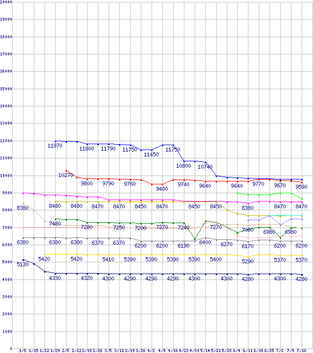 CPU主要製品(最安値1万円未満)の最安値推移↑前グラフ↓次グラフ(2010年1月8日〜2010年7月16日)※このグラフは過去のデータも税率5%相当に調整した税込み相当額のグラフです。凡例Athlon II X4 635 (2.9GHz,L2 512KB×4,TDP 95W)Phenom II X2 555 Black Edition (3.2GHz,L2 512KB×2,L3 6MB)Pentium E6700 (3.20GHz,L2 2MB)Pentium G6950 (2.8GHz)Athlon II X2 245e (2.9GHz,L2 1MB×2,TDP 45W)Athlon II X3 440 (3.0GHz,L2 512KB×3,TDP 95W)Athlon II X2 260 (3.2GHz,L2 1MB×2,TDP 65W)Pentium E6500 (2.93GHz,L2 2MB)Athlon II X2 255 (3.1GHz,L2 1MB×2,TDP 65W)Athlon II X2 240e (2.8GHz,L2 1MB×2,TDP 45W)Athlon II X2 250 (3.0GHz,L2 1MB×2,TDP 65W)Celeron E3400 (2.6GHz)Celeron E3300 (2.5GHz)※製品名をクリックすると個別のグラフを表示します※点線部は販売店が確認できなかった、または調査データがないことを示します