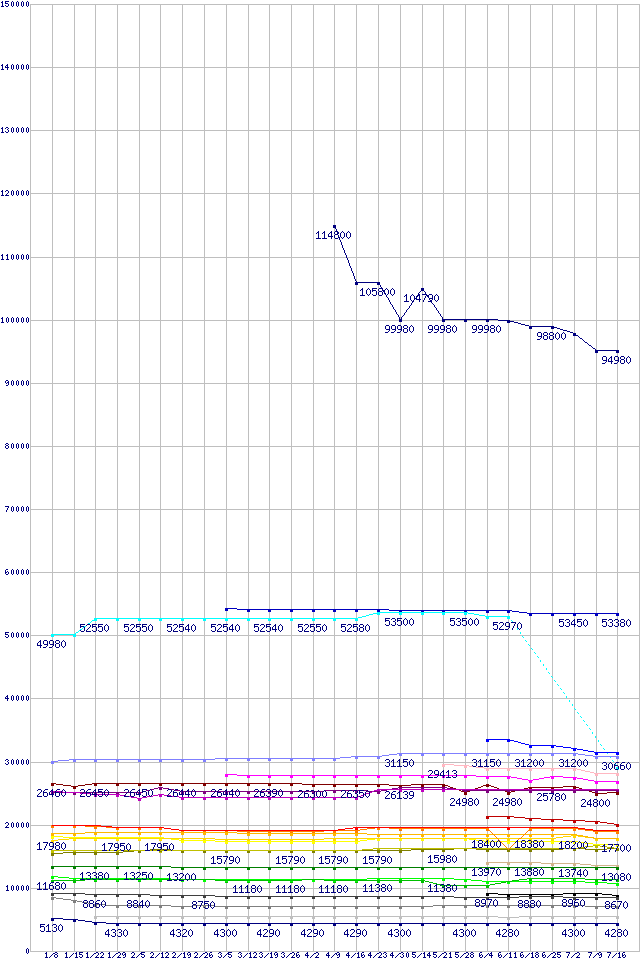 Intel系CPUの最安値推移↑前グラフ↓次グラフ(2010年1月8日〜2010年7月16日)※このグラフは過去のデータも税率5%相当に調整した税込み相当額のグラフです。凡例Core i7-980X Extreme Edition (3.33GHz)Core i7-960 (3.20GHz)Core i7-875K (2.93GHz)Core 2 Quad Q9650 (3.00GHz,L2 6MB×2)Core i7-870 (2.93GHz)Core i5-680 (3.6GHz)Core i7-930 (2.80GHz)Core 2 Quad Q9550 (2.83GHz,L2 6MB×2)Core 2 Duo E8600 (3.33GHz,L2 6MB)Core i7-860 (2.80GHz)Core i5-655K (3.2GHz)Core i5-661 (3.33GHz)Core i5-660 (3.33GHz)Core i5-750 (2.66GHz)Core 2 Duo E8500 (3.16GHz,L2 6MB)Core i5-650 (3.2GHz)Core 2 Quad Q8400 (2.66GHz,L2 2MB×2)Core 2 Duo E8400 (3GHz,L2 6MB)Core i3-550 (3.20GHz)Core 2 Duo E7600 (3.06GHz,L2 3MB)Core 2 Duo E7500 (2.93GHz,L2 3MB)Core i3-530 (2.93GHz)Pentium E6700 (3.20GHz,L2 2MB)Pentium G6950 (2.8GHz)Pentium E6500 (2.93GHz,L2 2MB)Celeron E3400 (2.6GHz)Celeron E3300 (2.5GHz)※製品名をクリックすると個別のグラフを表示します※点線部は販売店が確認できなかった、または調査データがないことを示します