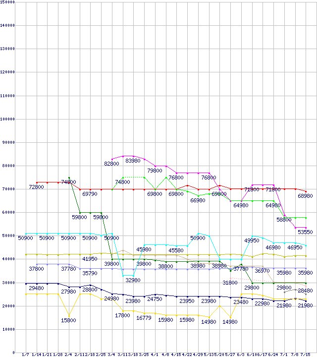 HDD/SSD主要製品(最安値2万円以上)の最安値推移↑前グラフ(2010年1月7日〜2010年7月15日)※このグラフは過去のデータも税率5%相当に調整した税込み相当額のグラフです。 税率変更や、総額表示方式導入(2004年4月)の影響は除いています。凡例その他2.5インチSSD 512GB (512GB,MLC)SSDSA2SH064G1C5 (64GB,SLC)CTFDDAC256MAG-1G1 (256GB,MLC)2.5インチSSD(SandForce製コントローラ) (200〜240GB,MLC)その他2.5インチSSD 256GB (256GB,MLC)X25-M(G2) (160GB,MLC)SSDSA2SH032G1 (32GB,SLC)CTFDDAC128MAG-1G1 (128GB,MLC)2.5インチSSD(SandForce製コントローラ) (100〜120GB,MLC)WD6000HLHX (600.0GB)WD4500HLHX (450.0GB)その他2.5インチSSD 128GB (128GB,MLC)ST32000641AS (2TB,64MB)※製品名をクリックすると個別のグラフを表示します※点線部は販売店が確認できなかった、または調査データがないことを示します