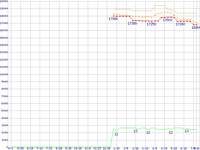 Core i5-650 (3.2GHz)の価格推移↑前グラフ↓次グラフ(2009年5月1日〜2010年7月16日)※このグラフは過去のデータも税率5%相当に調整した税込み相当額のグラフです。●関連グラフCPU主要製品の最安値推移CPU主要製品(最安値1万円〜2万円未満)の最安値推移Intel系CPUの最安値推移LGA1156 (L3キャッシュ4MB,Dual Core,GPU内蔵,Hyper-Threading,TDP 73〜87W)の最安値推移●凡例最安値(点線部は販売店未確認または未調査)平均値最高値ショップ数
