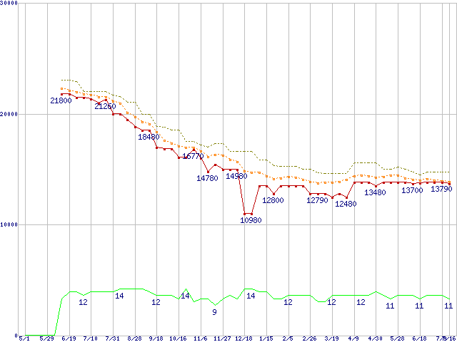 Phenom II X4 945 (3.0GHz,L2 512KB×4,L3 6MB,TDP 95W)の価格推移↓次グラフ(2009年5月1日〜2010年7月16日)※このグラフは過去のデータも税率5%相当に調整した税込み相当額のグラフです。●関連グラフCPU主要製品の最安値推移CPU主要製品(最安値1万円〜2万円未満)の最安値推移AMD系CPUの最安値推移Socket AM3 (HyperTransport 3.0,Quad Core)の最安値推移●凡例最安値(点線部は販売店未確認または未調査)平均値最高値ショップ数