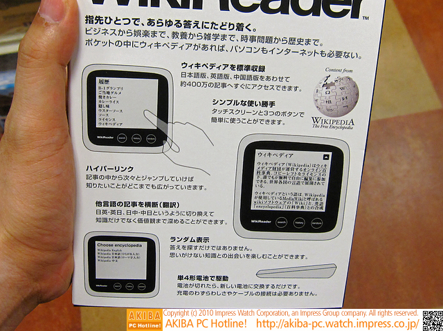 AKIBA PC Hotline! 2010年7月17日号Wikipediaベースの電子辞書が販売中今週見つけた新製品:モバイル機器/関連製品 BLUEDOT WikiReader(BWR-01)前の画像←→次の画像