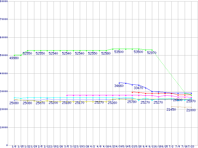CPU主要製品(最安値2万円〜3万円未満)の最安値推移↑前グラフ↓次グラフ(2010年1月8日〜2010年7月23日)※このグラフは過去のデータも税率5%相当に調整した税込み相当額のグラフです。凡例Phenom II X6 1090T Black Edition (3.2GHz,L2 512KB×6,L3 6MB,TDP 125W)Core i5-680 (3.6GHz)Core i7-870 (2.93GHz)Core i7-930 (2.80GHz)Core i7-860 (2.80GHz)Core 2 Quad Q9550 (2.83GHz,L2 6MB×2)Core 2 Duo E8600 (3.33GHz,L2 6MB)Phenom II X6 1055T (2.8GHz,L2 512KB×6,L3 6MB,TDP 95W)※製品名をクリックすると個別のグラフを表示します※点線部は販売店が確認できなかった、または調査データがないことを示します