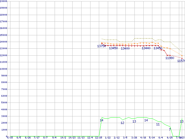 Core i3-540 (3.06GHz)の価格推移↑前グラフ↓次グラフ(2009年5月15日〜2010年7月23日)※このグラフは過去のデータも税率5%相当に調整した税込み相当額のグラフです。●関連グラフCPU主要製品の最安値推移CPU主要製品(最安値1万円〜2万円未満)の最安値推移Intel系CPUの最安値推移LGA1156 (L3キャッシュ4MB,Dual Core,GPU内蔵,Hyper-Threading,TDP 73〜87W)の最安値推移●凡例最安値(点線部は販売店未確認または未調査)平均値最高値ショップ数