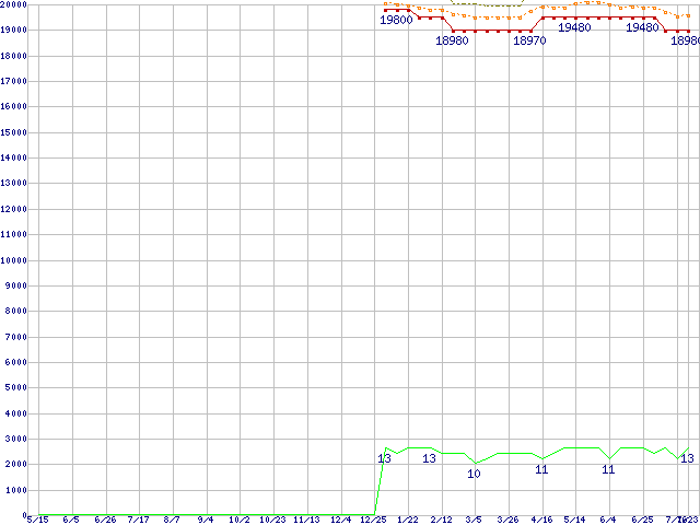 Core i5-661 (3.33GHz)の価格推移↑前グラフ↓次グラフ(2009年5月15日〜2010年7月23日)※このグラフは過去のデータも税率5%相当に調整した税込み相当額のグラフです。●関連グラフCPU主要製品の最安値推移CPU主要製品(最安値1万円〜2万円未満)の最安値推移Intel系CPUの最安値推移LGA1156 (L3キャッシュ4MB,Dual Core,GPU内蔵,Hyper-Threading,TDP 73〜87W)の最安値推移●凡例最安値(点線部は販売店未確認または未調査)平均値最高値ショップ数