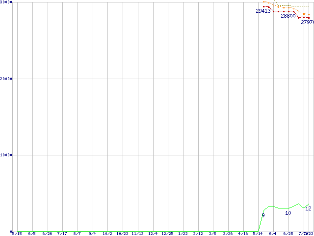 Core i5-680 (3.6GHz)の価格推移↑前グラフ↓次グラフ(2009年5月15日〜2010年7月23日)※このグラフは過去のデータも税率5%相当に調整した税込み相当額のグラフです。●関連グラフCPU主要製品の最安値推移CPU主要製品(最安値2万円〜3万円未満)の最安値推移Intel系CPUの最安値推移LGA1156 (L3キャッシュ4MB,Dual Core,GPU内蔵,Hyper-Threading,TDP 73〜87W)の最安値推移●凡例最安値(点線部は販売店未確認または未調査)平均値最高値ショップ数
