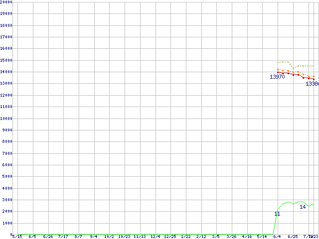Core i3-550 (3.20GHz)の価格推移↑前グラフ↓次グラフ(2009年5月15日〜2010年7月23日)※このグラフは過去のデータも税率5%相当に調整した税込み相当額のグラフです。●関連グラフCPU主要製品の最安値推移CPU主要製品(最安値1万円〜2万円未満)の最安値推移Intel系CPUの最安値推移LGA1156 (L3キャッシュ4MB,Dual Core,GPU内蔵,Hyper-Threading,TDP 73〜87W)の最安値推移●凡例最安値(点線部は販売店未確認または未調査)平均値最高値ショップ数
