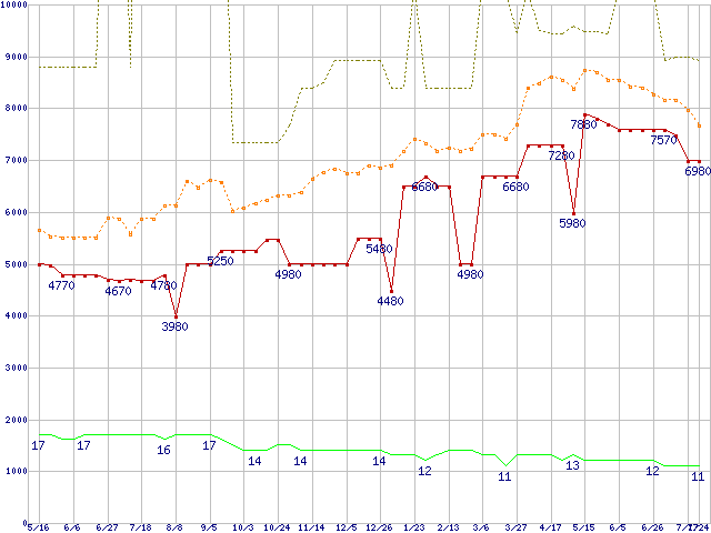 PC3-10600 1GB×3枚組みセットの価格推移↑前グラフ↓次グラフ(2009年5月16日〜2010年7月24日)※このグラフは過去のデータも税率5%相当に調整した税込み相当額のグラフです。 税率変更や、総額表示方式導入(2004年4月)の影響は除いています。●関連グラフメモリ主要製品の最安値推移メモリ主要製品(最安値5千円〜1万円未満)の最安値推移PC3-10600(DDR3-1333) DDR3 SDRAM DIMMの最安値推移●凡例最安値(点線部は販売店未確認または未調査)平均値最高値ショップ数