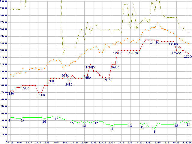 PC3-10600 2GB×3枚組みセットの価格推移↑前グラフ↓次グラフ(2009年5月16日〜2010年7月24日)※このグラフは過去のデータも税率5%相当に調整した税込み相当額のグラフです。 税率変更や、総額表示方式導入(2004年4月)の影響は除いています。●関連グラフメモリ主要製品の最安値推移メモリ主要製品(最安値1万円以上)の最安値推移PC3-10600(DDR3-1333) DDR3 SDRAM DIMMの最安値推移●凡例最安値(点線部は販売店未確認または未調査)平均値最高値ショップ数
