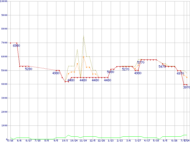 PC3-12800 2GBの価格推移↑前グラフ↓次グラフ(2009年5月16日〜2010年7月24日)※このグラフは過去のデータも税率5%相当に調整した税込み相当額のグラフです。 税率変更や、総額表示方式導入(2004年4月)の影響は除いています。●関連グラフメモリ主要製品の最安値推移2GBモジュール/1GBモジュール×2枚の最安値推移メモリ主要製品(最安値5千円未満)の最安値推移PC3-12800(DDR3-1600) DDR3 SDRAM DIMMの最安値推移●凡例最安値(点線部は販売店未確認または未調査)平均値最高値ショップ数