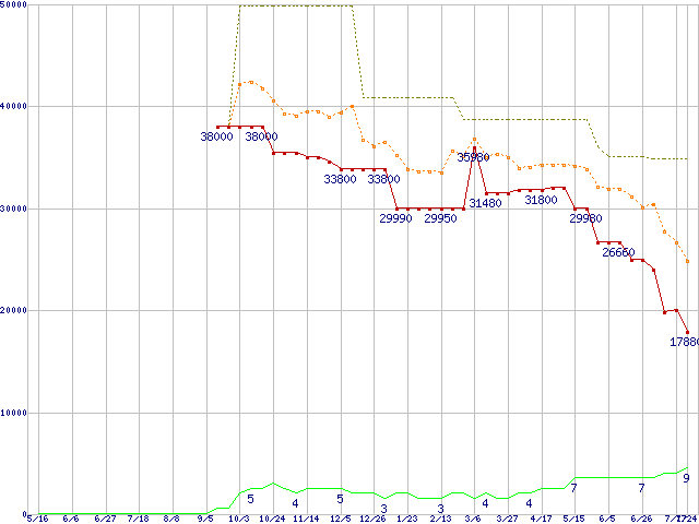 PC3-10600 4GB×2枚組みセットの価格推移↑前グラフ↓次グラフ(2009年5月16日〜2010年7月24日)※このグラフは過去のデータも税率5%相当に調整した税込み相当額のグラフです。 税率変更や、総額表示方式導入(2004年4月)の影響は除いています。●関連グラフメモリ主要製品の最安値推移メモリ主要製品(最安値1万円以上)の最安値推移PC3-10600(DDR3-1333) DDR3 SDRAM DIMMの最安値推移●凡例最安値(点線部は販売店未確認または未調査)平均値最高値ショップ数