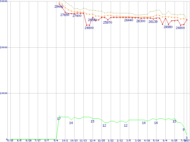 Core i7-860 (2.80GHz)の価格推移↑前グラフ↓次グラフ(2009年5月15日〜2010年7月23日)※このグラフは過去のデータも税率5%相当に調整した税込み相当額のグラフです。●関連グラフCPU主要製品の最安値推移CPU主要製品(最安値2万円〜3万円未満)の最安値推移Intel系CPUの最安値推移LGA1156 (L3キャッシュ8MB,Quad Core,Hyper-Threading,TDP 82〜95W)の最安値推移●凡例最安値(点線部は販売店未確認または未調査)平均値最高値ショップ数