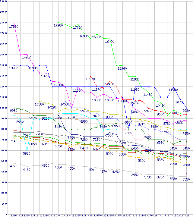 | HDD/SSD主要製品(最安値1万円未満)の最安値推移 |